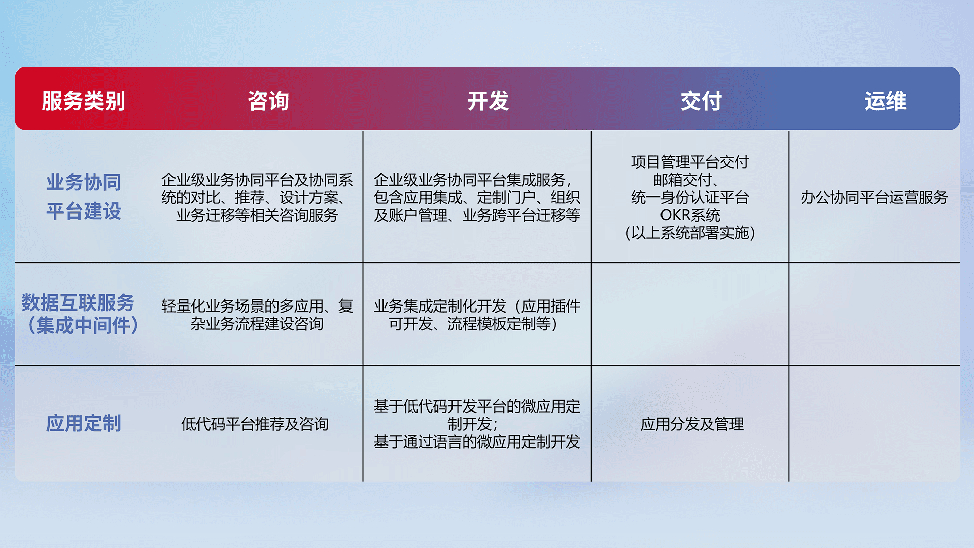 针对钉钉、、、企微、、、、IDaas等平台级产品提供产品的规划、、方案、、、、交付、、、、定制化开发等服务,,实现如统一协同办公、、智能客户服务、、、混合会议管理、、、智能数据查询、、、等业务场景,,实现数字化转型。。。。