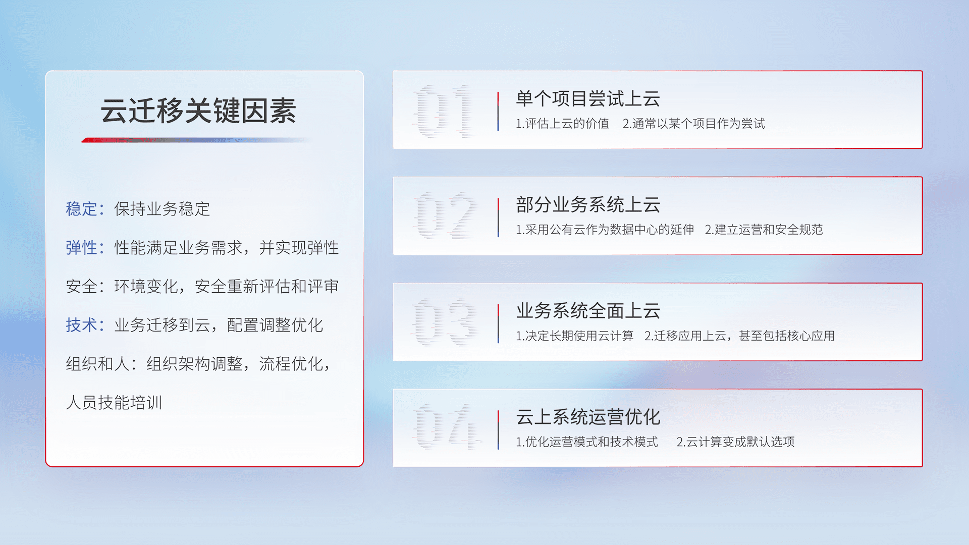 结合实际业务,,从规划设计、、、云平台选型、、、云原生改造、、、数据迁移、、、集成交付,,迁移全过程为客户识别最佳上云路径,,做好风险识别管理,,设计网络架构、、身份权限、、安全审计合规、、、、操作审计、、日志审计、、、监控告警策略、、多站点容灾设计等,,,,对云上基础设施进行整体规划,,,提升IT治理水平,,,,以满足弹性、、高可用、、、、高性能的需求。。。