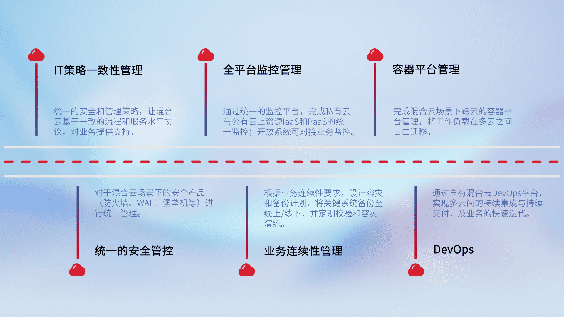 通过多云纳管,,以统一的资源数据模型把客户的云资源进行抽象和封装,,,进而实现对多云资源的统一操作,,,,保障云资源管理的可靠性、、、稳定性与可用性。。。。量身定制化运维内容,,,配置、、、开发运维、、、补丁管理、、、、备份、、监控、、认证和访问管理、、、审计和日常巡检等,,保障在用云过程中的可靠度,,,稳定度以及高可用率。。。。